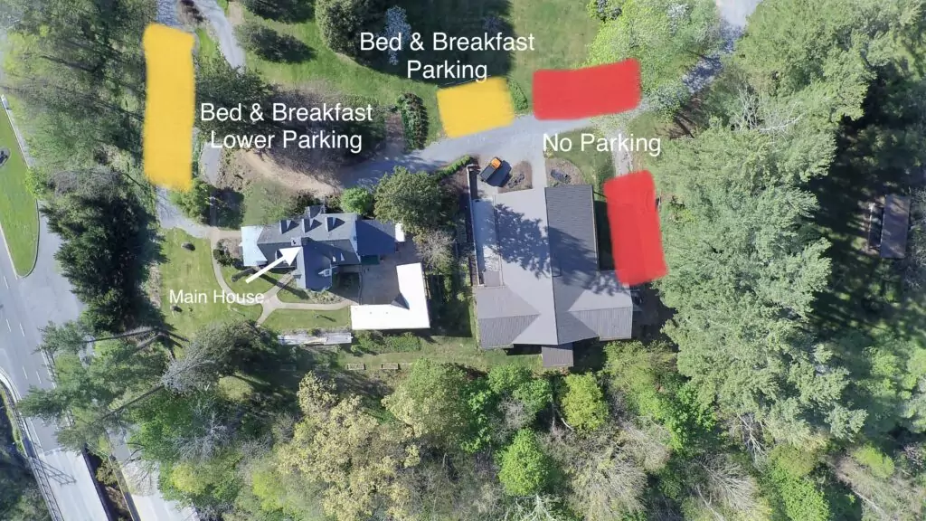 The main house is to the right or river view of the property. The main gravel driveway loops around and has 2 main parking areas. In front of the Pavilion (large covered space) and to the lower right of the house. You are welcome to pull right up to the front door when arriving. The Innkeeper will greet you and show you to your rooms as well as the layout of the property.